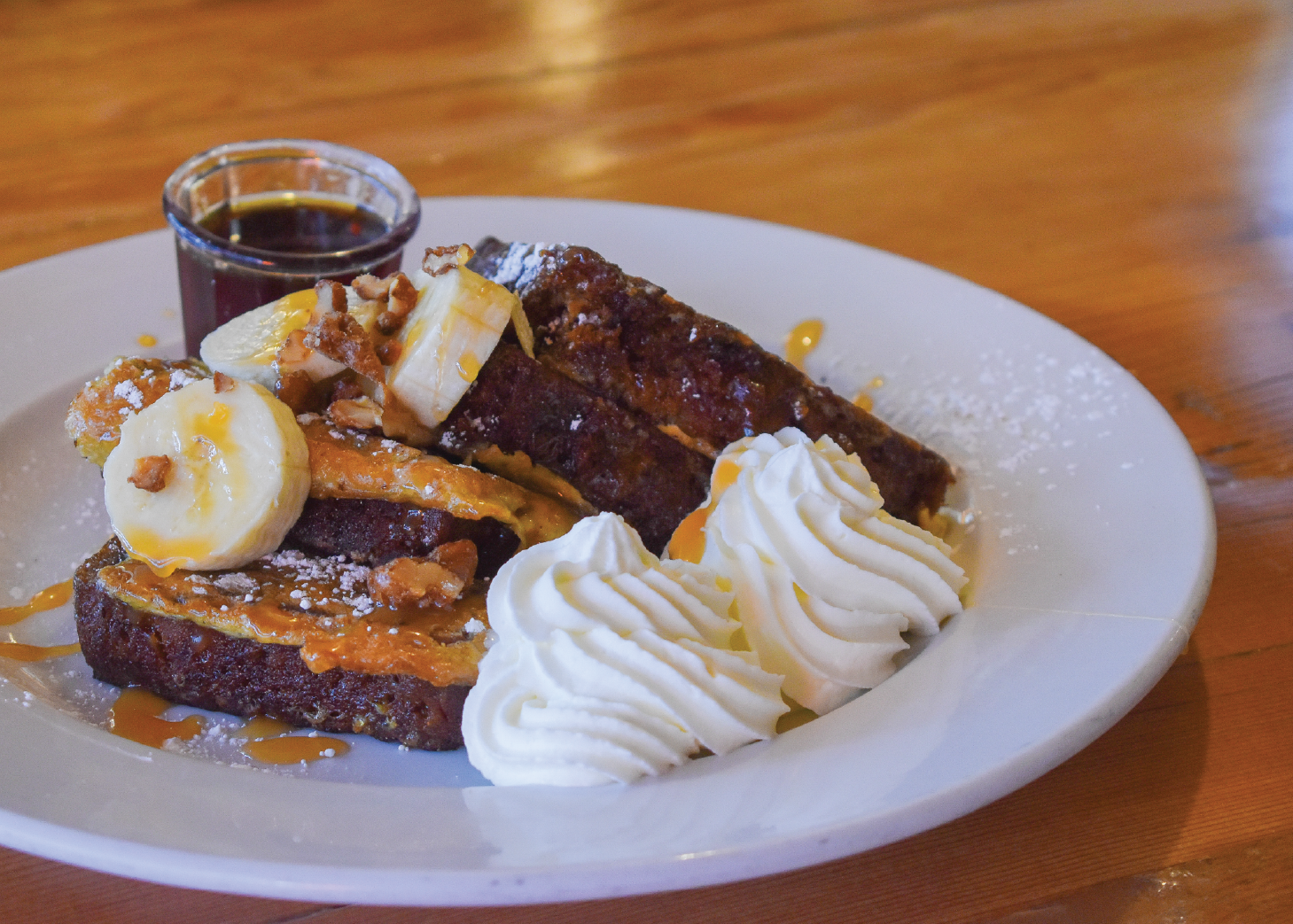 Topped with bananas, candied walnuts, whipped cream, and caramel sauce. Served with warm banana syrup.