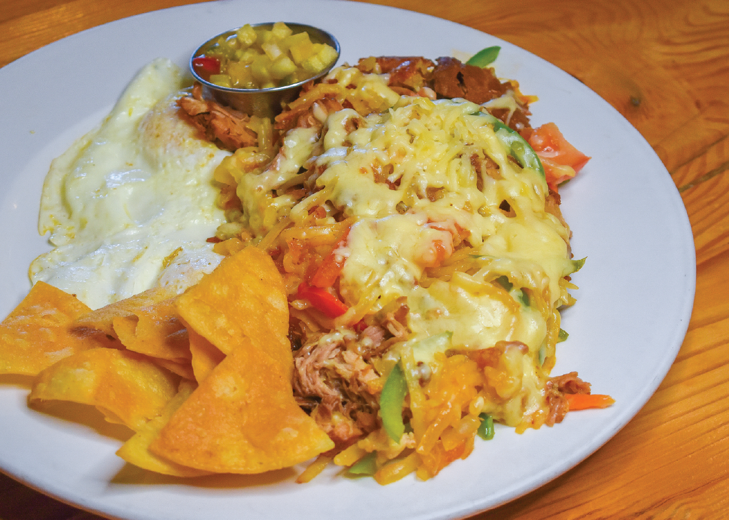 Pulled pork, hash browns, tomatoes, peppers, onions, jalapeños, and carrots topped with chihuahua cheese, two eggs, tortilla chips, and apple pico de gallo.