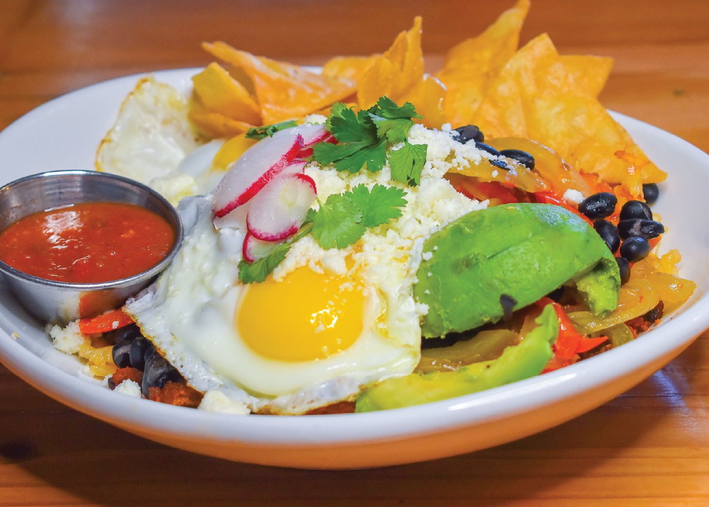 Spanish chorizo, hash browns, black beans, scrambled eggs, onions, peppers, corn, avocado, queso fresco, radish, and cilantro. Served with chips and salsa.