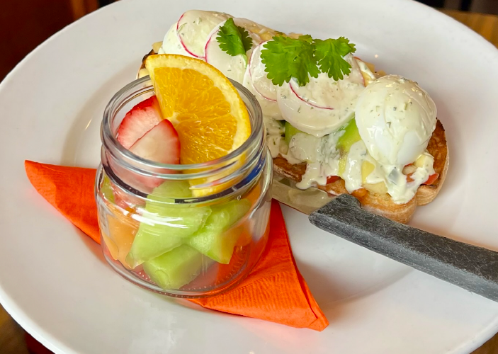 White toast topped with sliced avocado, apple pico, hard boiled egg, cilantro, and radish. Drizzled with honey and herb crème fraîche. Served with fruit.