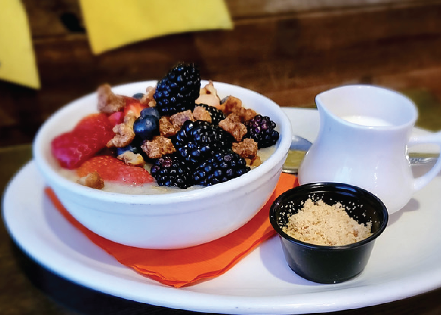 Topped with fresh berries and candied walnuts. Served with milk and brown sugar.