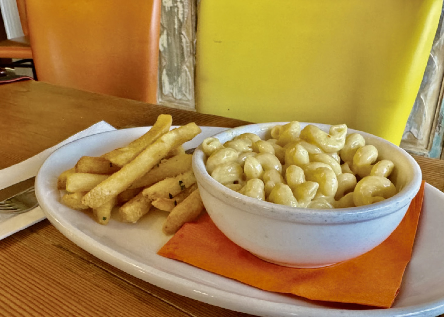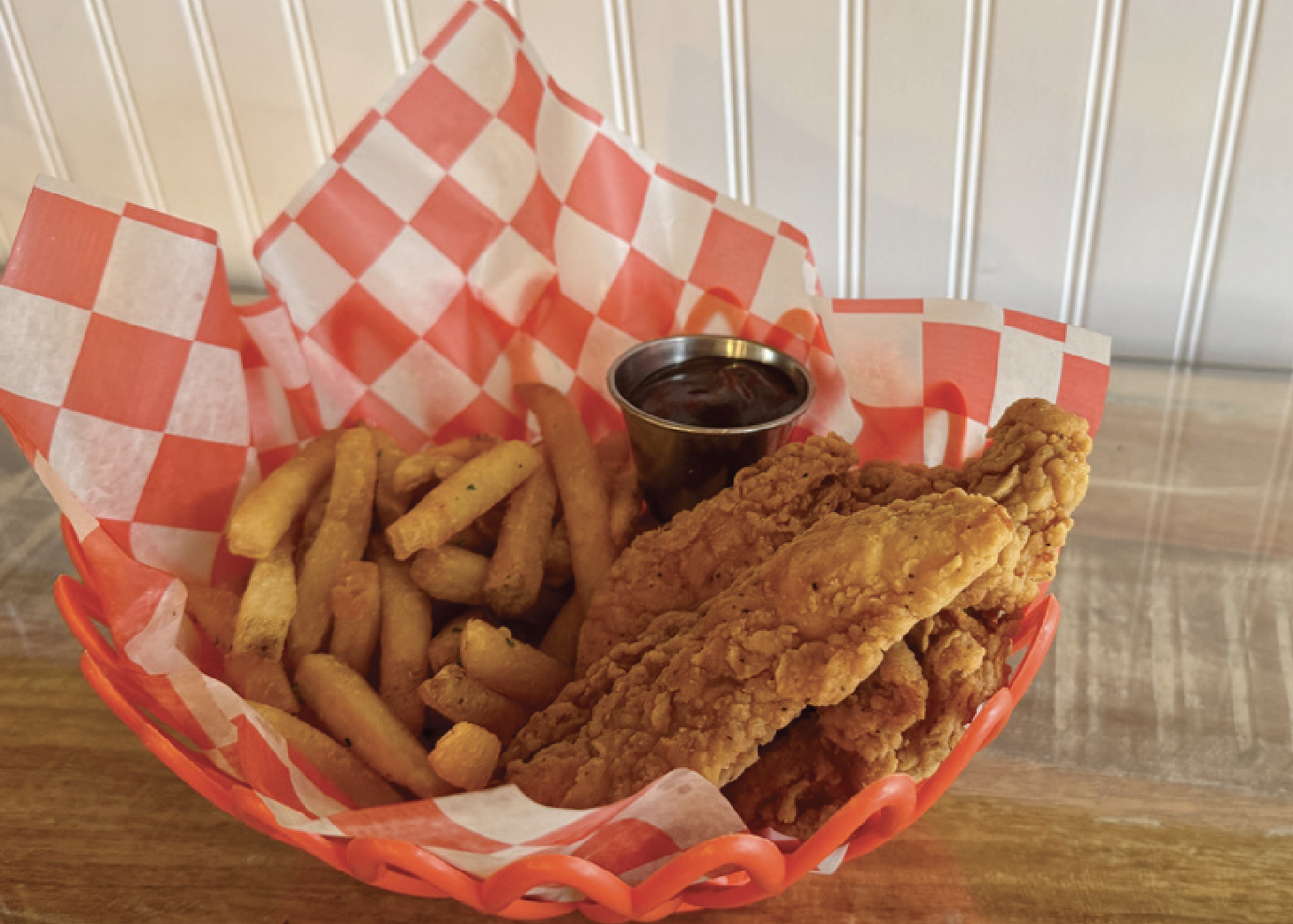 Bacon, lettuce, and tomato sandwich served with fries or fruit.