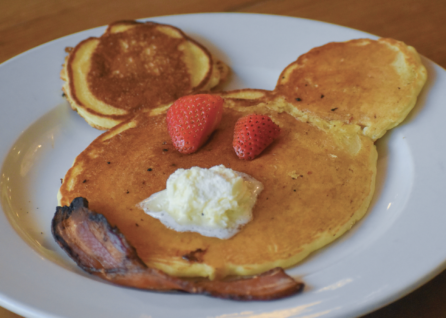 Fluffy pancake swirled with cinnamon roll flavor, served with bacon or sausage.