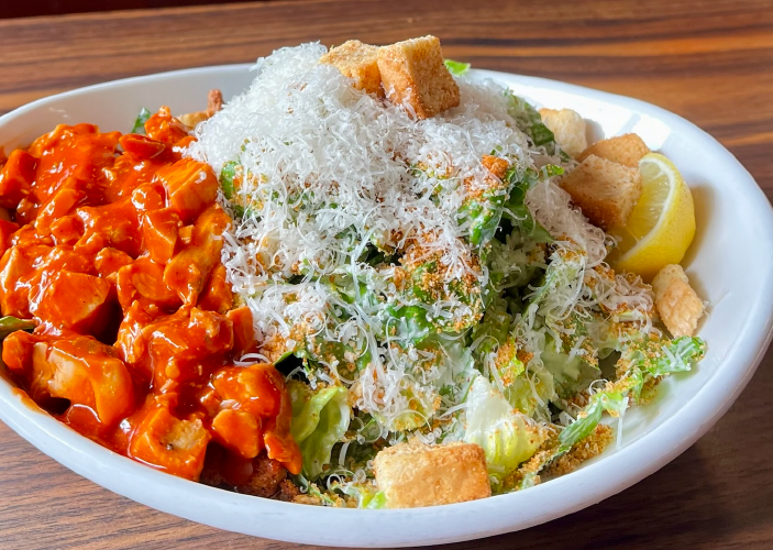 Crisp romaine, garlic croutons, parmesan, and spicy buffalo chicken.
