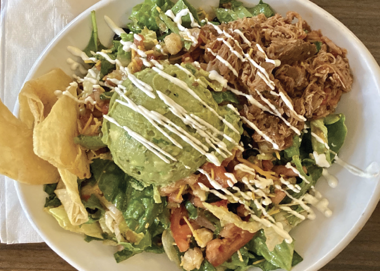 Mixed greens with cilantro, pico de gallo, black beans, tomatoes, hominy, cheddar cheese, radishes, and tortilla chips topped with guacamole and crema tossed in our Baja vinaigrette with choice of pork carnitas, ground beef, or chicken.